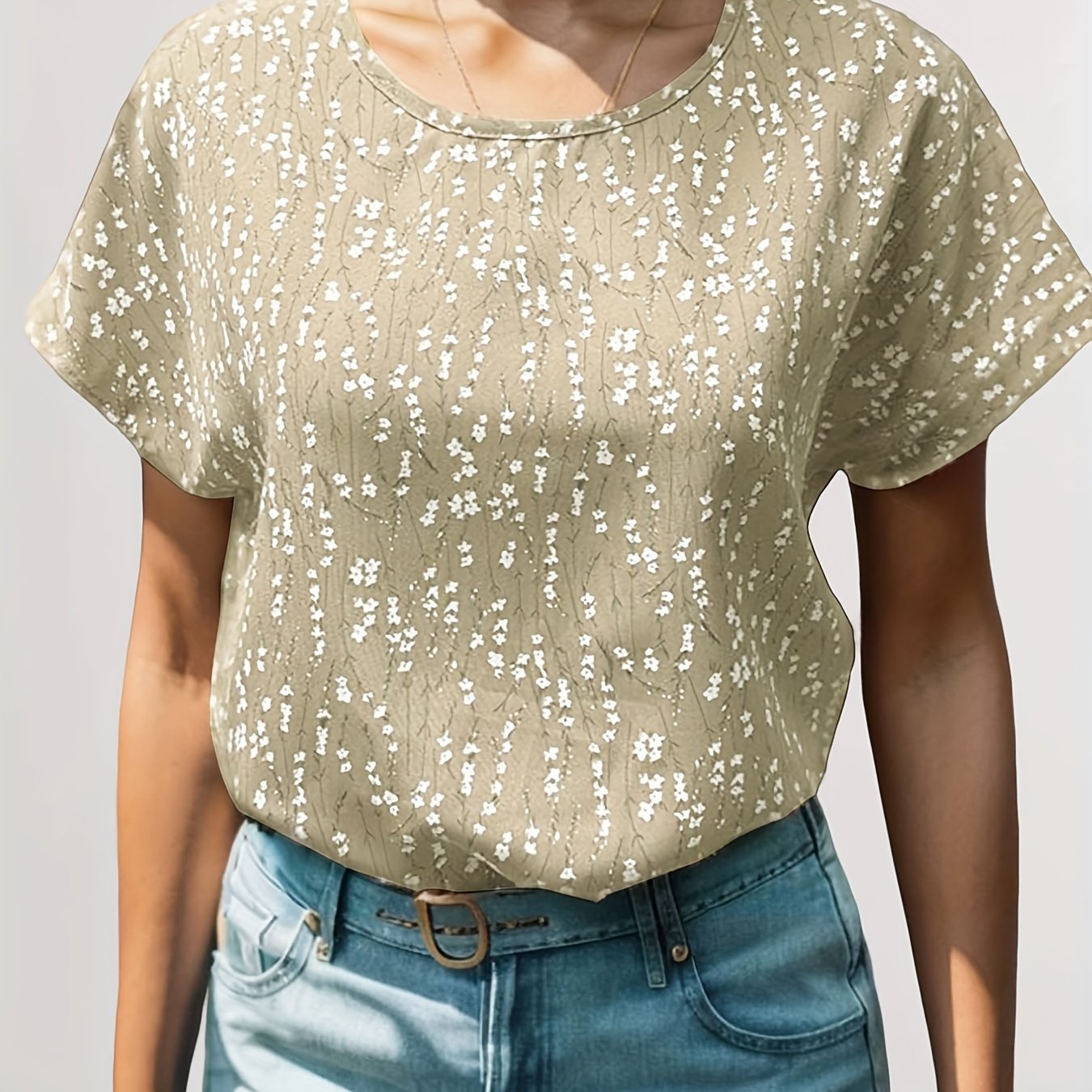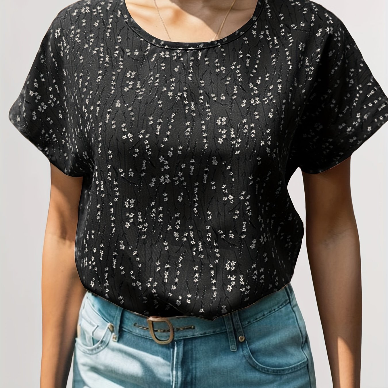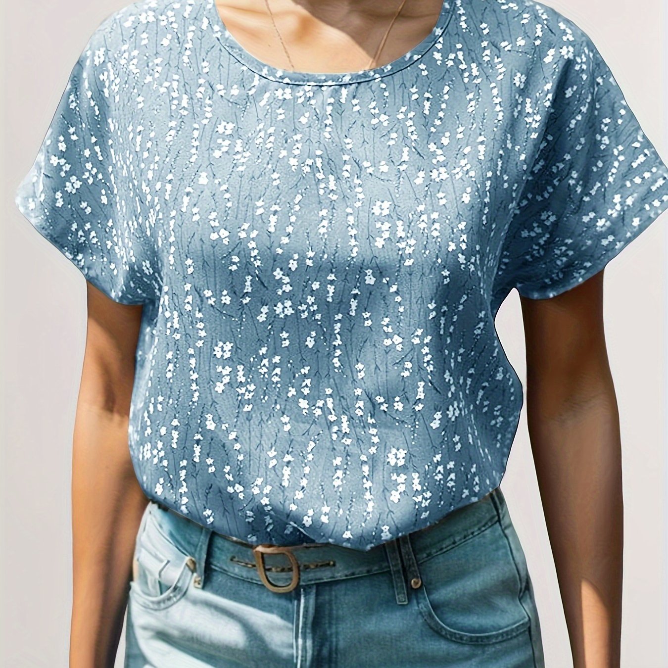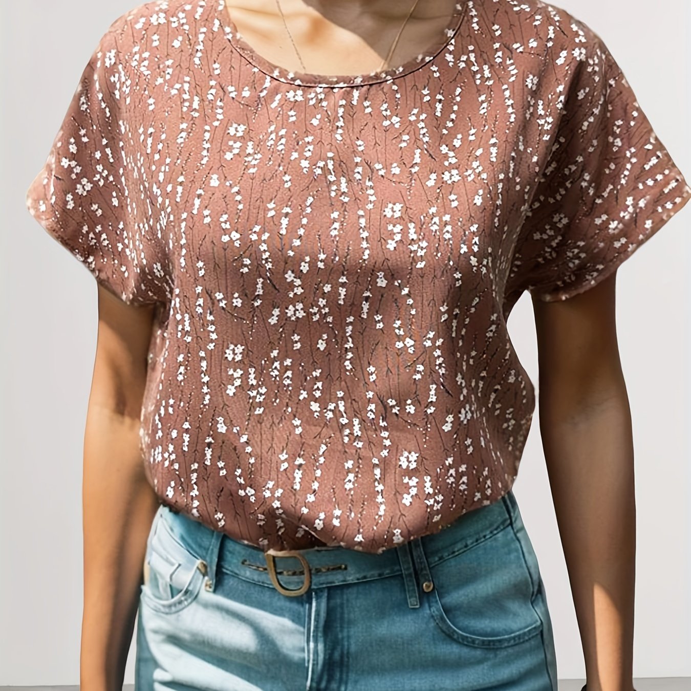 Crew Neck Floral Print Blouse, Casual Short Sleeve Blouse For Spring & Summer, Women’s Clothing