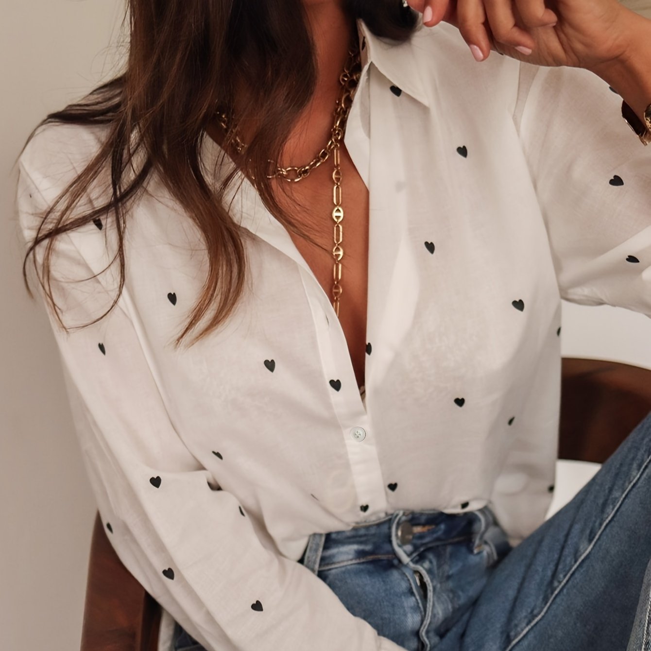 5 reviews for Heart Print Button Front Shirt, Cute Long Sleeve Shirt For Spring & Fall, Women’s Clothing