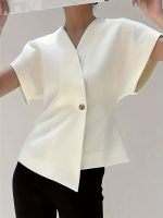 solid button front asymmetric blouse stylish short sleeve blouse for spring summer womens clothing details 1