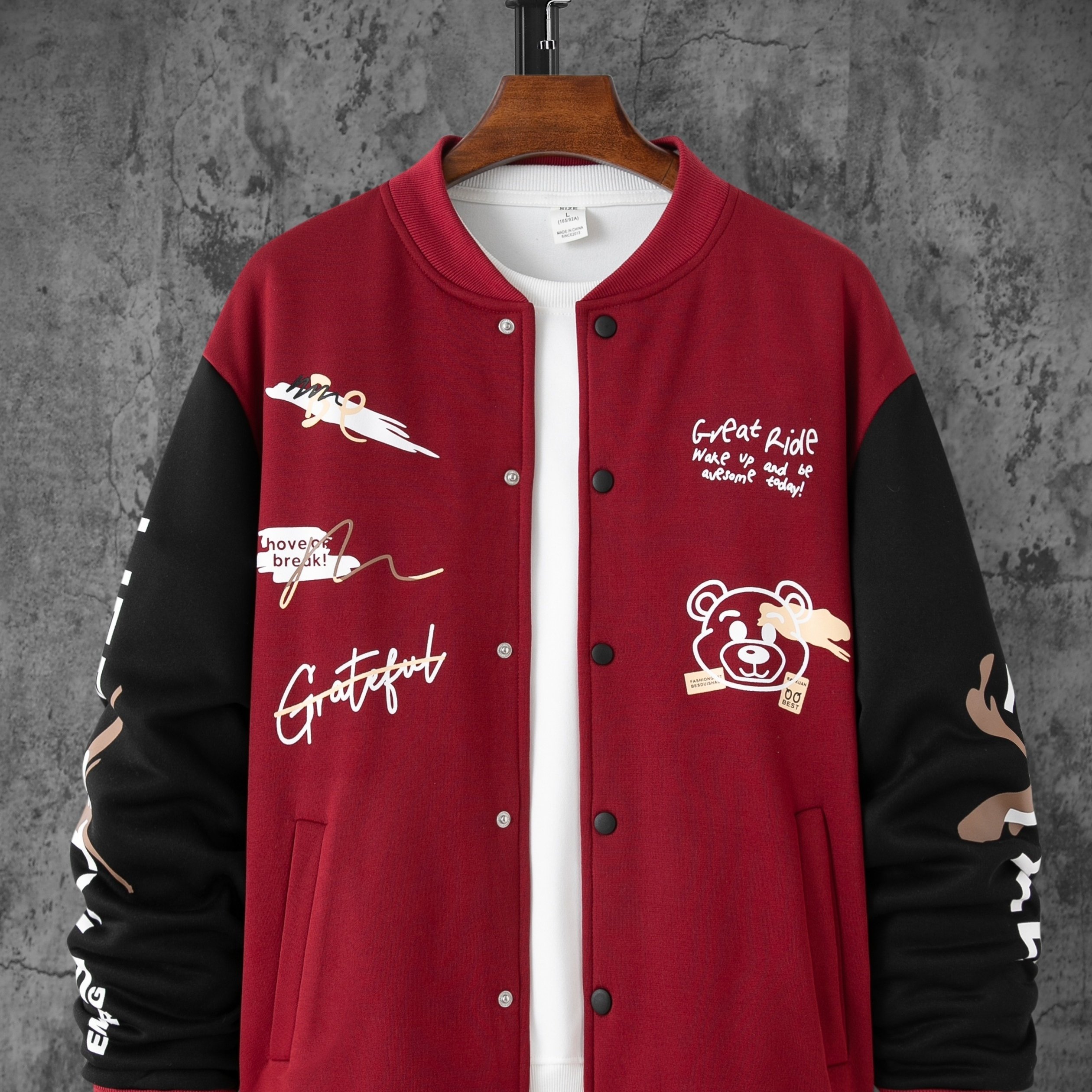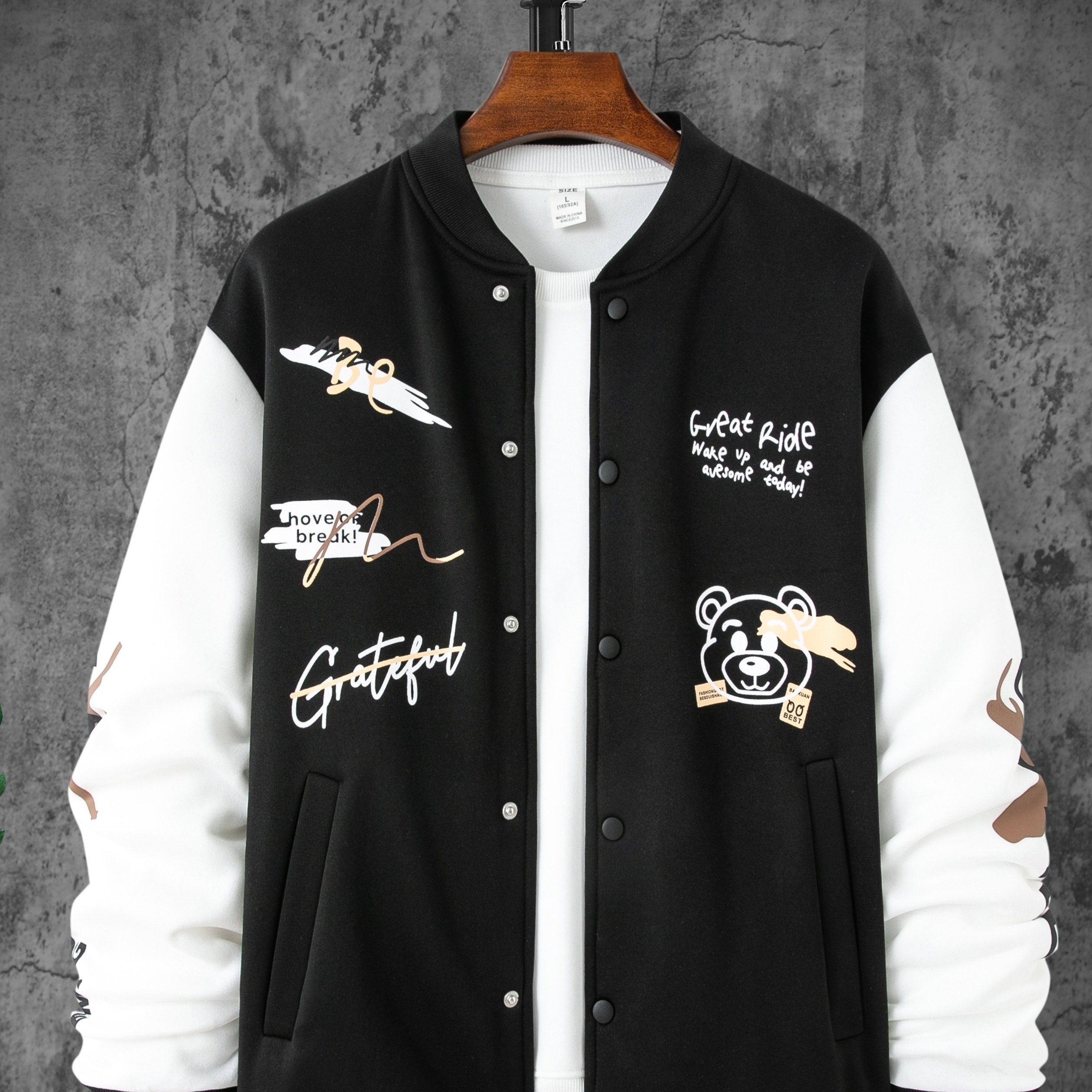 Men’s Doodles Print Color Block Varsity Jacket – Casual Baseball Coat for Spring and Autumn
