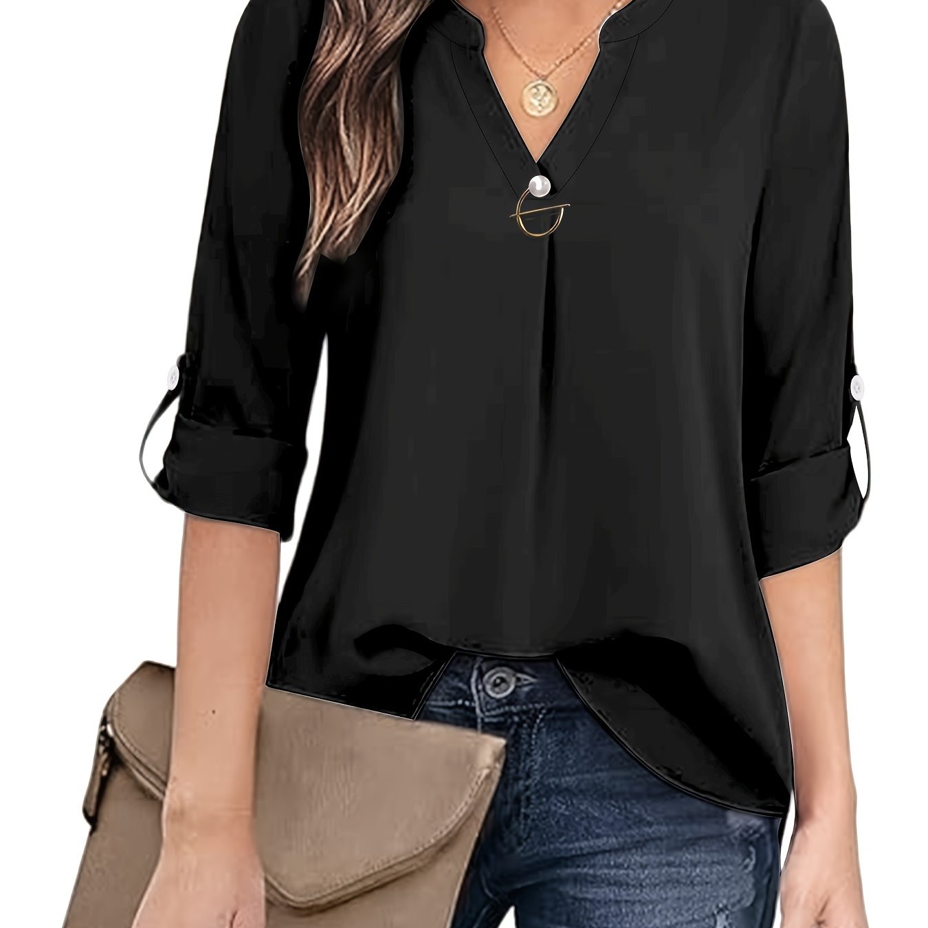 A very good quality Solid Color Notch Neck Blouse, Casual Long Sleeve Blouse For Spring & Fall, Women’s Clothing for this price, I am very happy great thanks.
