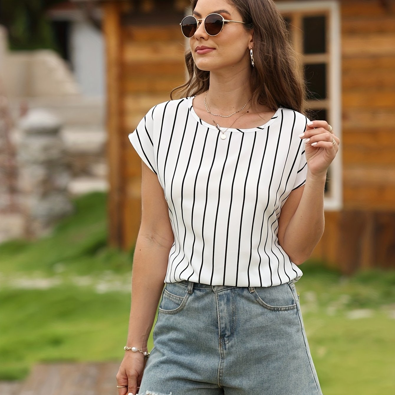 Striped Print Blouse, Casual Crew Neck Short Sleeve Simple Blouse, Women’s Clothing